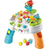 Wanneer een bal door de glijbaan gegooid wordt, rolt die over de wieltjes heen en eindigt hij in de voet van de tafel. Er zijn nog meer activiteiten te ontdekken dus je kleintje zal zich zeker niet hoeven vervelen met deze leuke interactieve tafel!