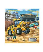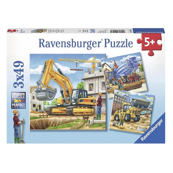 Beleef veel puzzelplezier met deze Ravensburger puzzels met afbeeldingen van een graafmachine, betonauto en een shovel.