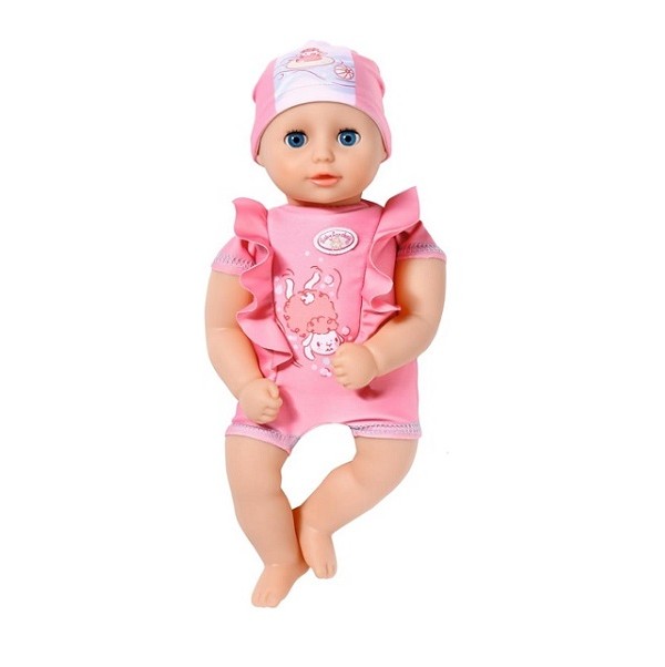 Pop Annabell is gekleed in een roze badpak versierd met blauwe patches en ruches aan de voorkant en een schattig zwemmutsje met lammetjes. Zet haar in het bad om met water te spelen.