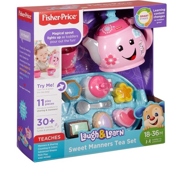 Dit speelgoedservies bestaat uit een theepot, suikerpot, 2 kopjes, 5 cakejes, een lepel en een dienblad. Het Fisher Price Goede Manieren Theeservies leert kinderen in een rollenspel manieren, samen delen, tellen, verschillende vormen en kleuren.