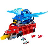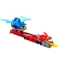 Druk op de knop om zijn vleugels te laten bewegen, zodat hij op een echte draak lijkt, en klap ze daarna in, zodat hij auto's kan opeten. Keer terug naar de grote draak en zet de auto's in de lanceerders waarna ze zij aan zij de banen op kunnen racen!
