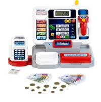 Deze elektronische speelgoedkassa op batterijen heeft een afneembare tablet met rekenfunctie.