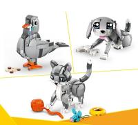 Je kunt 3 verschillende dieren bouwen met dezelfde set stenen: een verstelbare kat die kan zitten staan en springen, een verstelbaar hondje met een bot en een duif met broodkruimels.