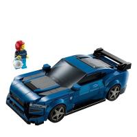 Deze Ford Mustang Dark Horse raceauto heeft een opvallende achtervleugel, grille, koplampen, uitlaatpijpen, Ford logo's en een gedetailleerd interieur.