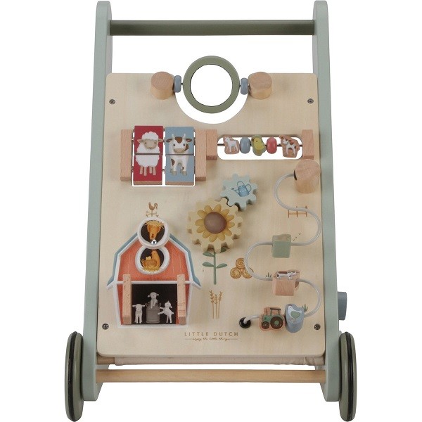 Daag je baby uit met de vele activiteiten op deze mooi gedecoreerde loopwagen. Er zijn 8 activiteiten om te ontdekken en onder de knie te krijgen. Wie zitten er in de schuur en draai aan de blokjes om de dieren compleet te maken? Door het stevige ontwerp is de loopwagen goed geschikt om te leren lopen.