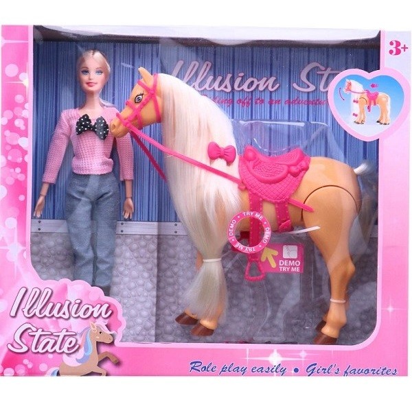 Set bevat een Tienerpop gekleed n een sportief outfit, met een echt lopend paard.