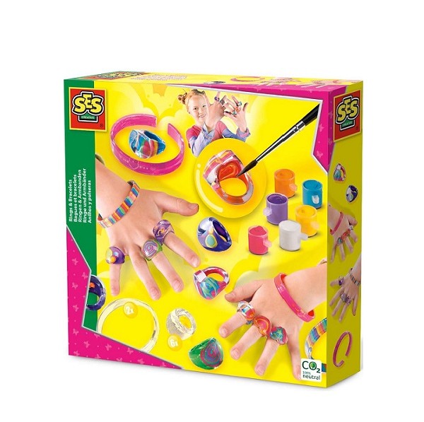 Inclusief: 6 ringen in verschillende maten, twee armbanden, verf en een penseel.