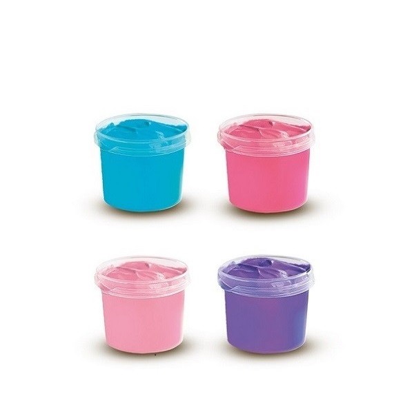 Set bevat: 4 potjes, ieder met 110ml trendy vingerverf, in de kleuren felroze, paars, pink en blauw.