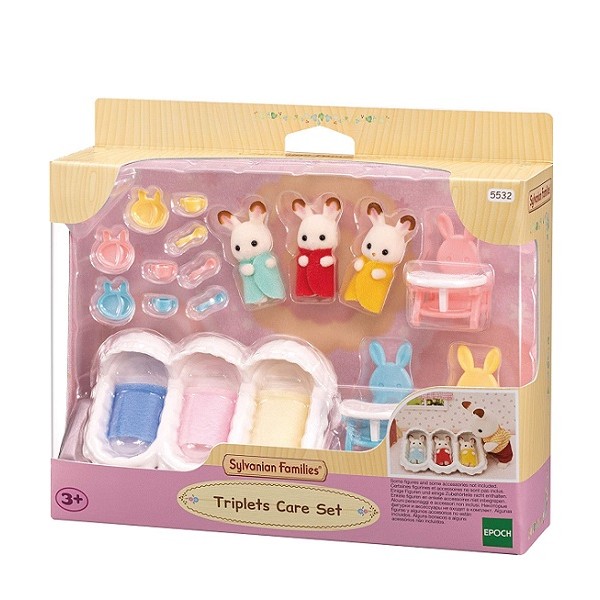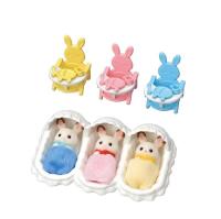 Dit verzorgingsset bevat een schattige baby Chocoladekonijn drieling in een wiegje en babymeubels.