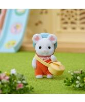 Baby Marshmallow Muis van Sylvanian Families met hoedje en tasje.